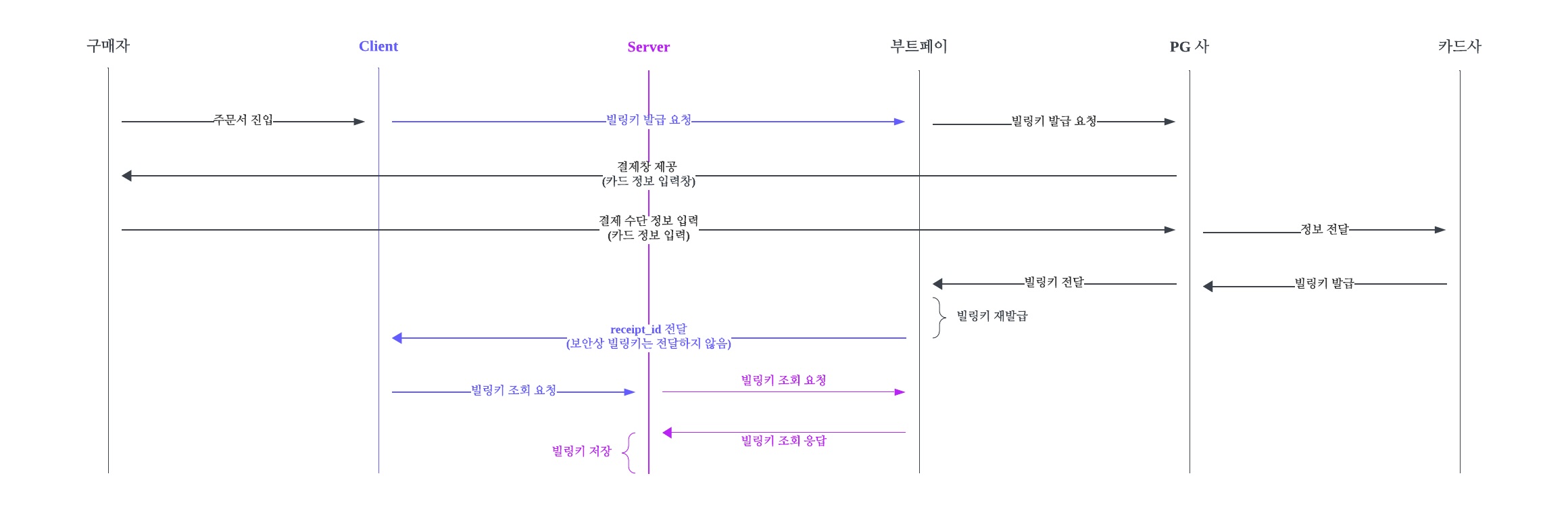 // ------ STEP 1. SDK Import ------import Bootpay from '@bootpay/client-js' export default { methods: { // ------ STEP 2. 빌링키 발급 요청 ------ async requestBillingKey() { try { const response = await Bootpay.requestSubscription({ application_id: '5b8f6a4d396fa665fdc2b5e7', pg: 'nicepay', method: 'card_auto', order_name: '정기결제 카드 등록', subscription_id: 'SUB-' + Date.now(), price: 0, tax_free: 0, user: { id: 'user_123', username: '홍길동', phone: '01012345678', email: 'user@example.com' }, extra: { open_type: 'iframe', subscribe_test_payment: true } }) // ------ STEP 3. 발급 결과 처리 ------ switch (response.event) { case 'done': console.log('빌링키 발급 완료:', response.receipt_id) this.lookupBillingKeyOnServer(response.receipt_id) break case 'issued': console.log('가상계좌 발급:', response) break } } catch (e) { switch (e.event) { case 'cancel': console.log('사용자 취소:', e.message) break case 'error': console.log('발급 오류:', e.error_code, e.message) break } } }, // ------ STEP 4. 서버에서 빌링키 조회 ------ async lookupBillingKeyOnServer(receiptId) { const result = await fetch('/api/billing/lookup', { method: 'POST', headers: { 'Content-Type': 'application/json' }, body: JSON.stringify({ receipt_id: receiptId }) }).then(res => res.json()) if (result.billing_key) { alert('카드 등록이 완료되었습니다!') this.$router.push('/mypage/cards') } } }}