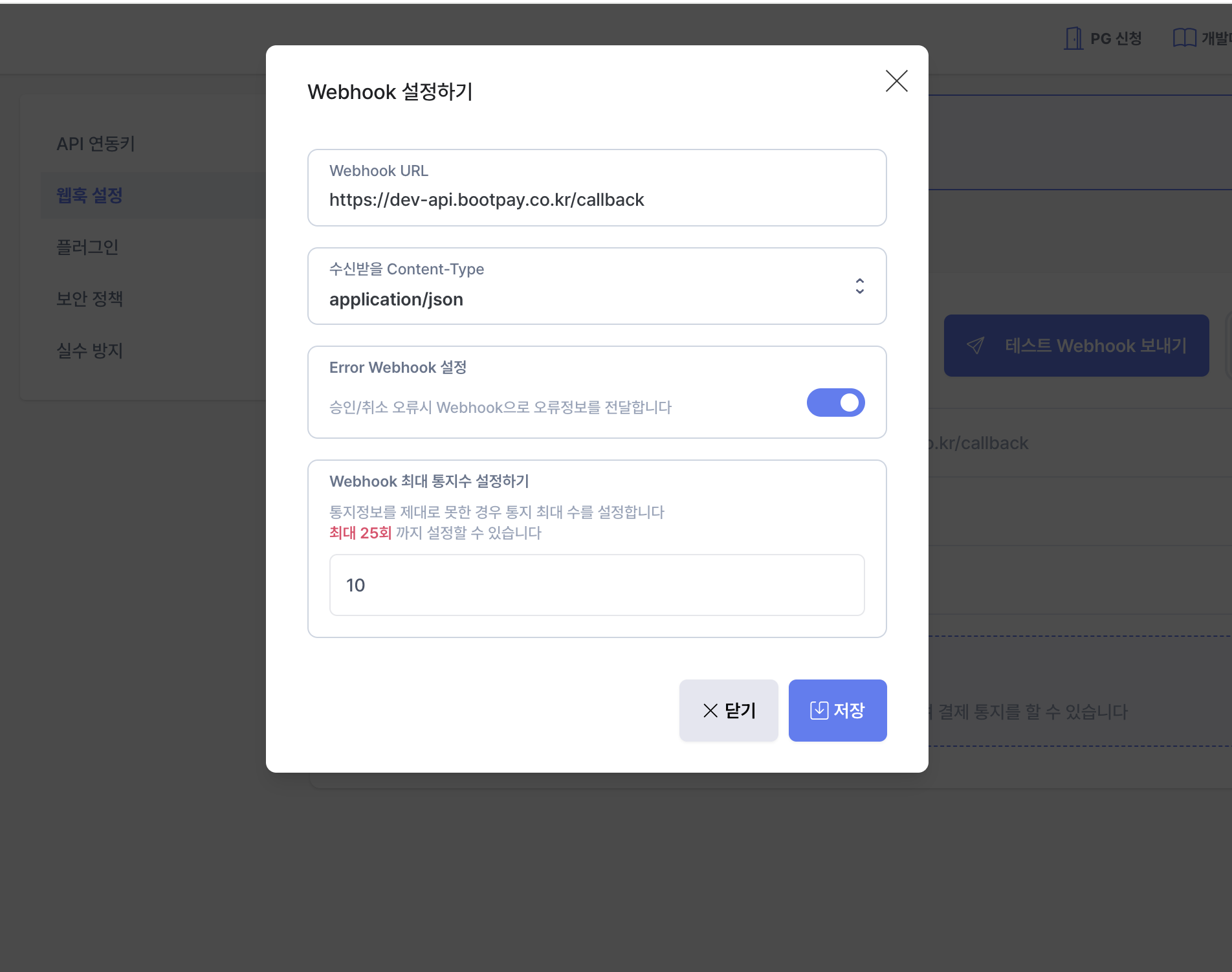 2.Webhook 설정하기버튼을 누른 뒤Webhook URL,수신 받을 Content-Type,Error Webhook 수신,Webhook 최대 통지수를 설정합니다.