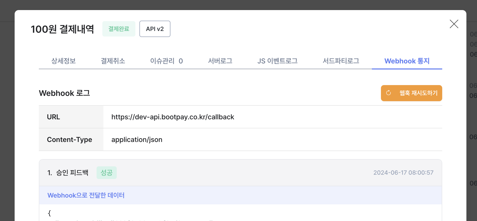 웹훅을 정상적으로 수신하였다면, HTTP Content-Type은application/json의 형태로{"success":true}를 응답하면, 부트페이 웹훅 서버에서 이를 확인하고 더 이상 웹훅을 보내지 않습니다. 만약 위의 값으로 응답하지 않으면 부트페이 웹훅 서버에서 일정 시간 후 웹훅을 재발송합니다.