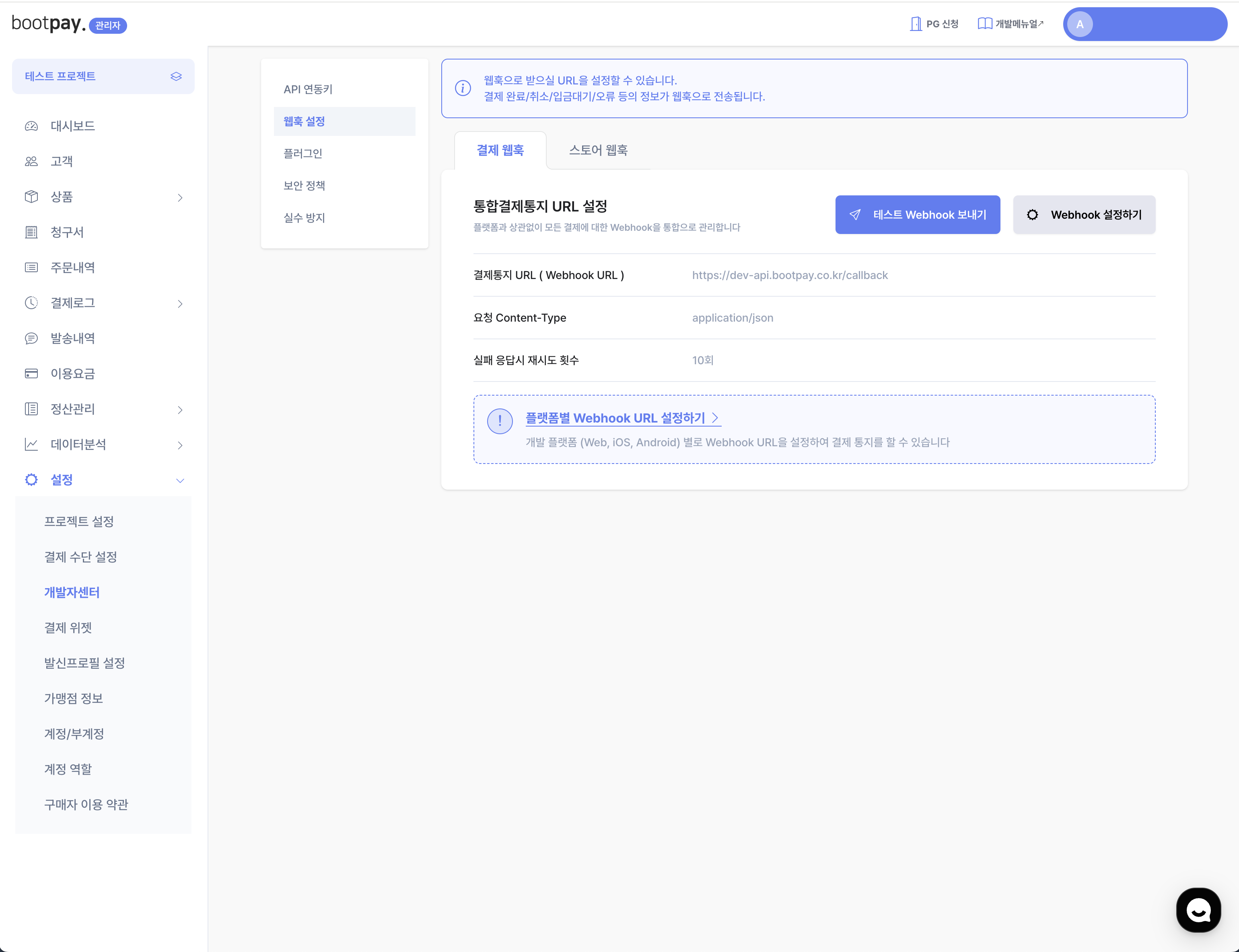 관리자에서 웹훅을 받도록 설정할 수 있습니다.