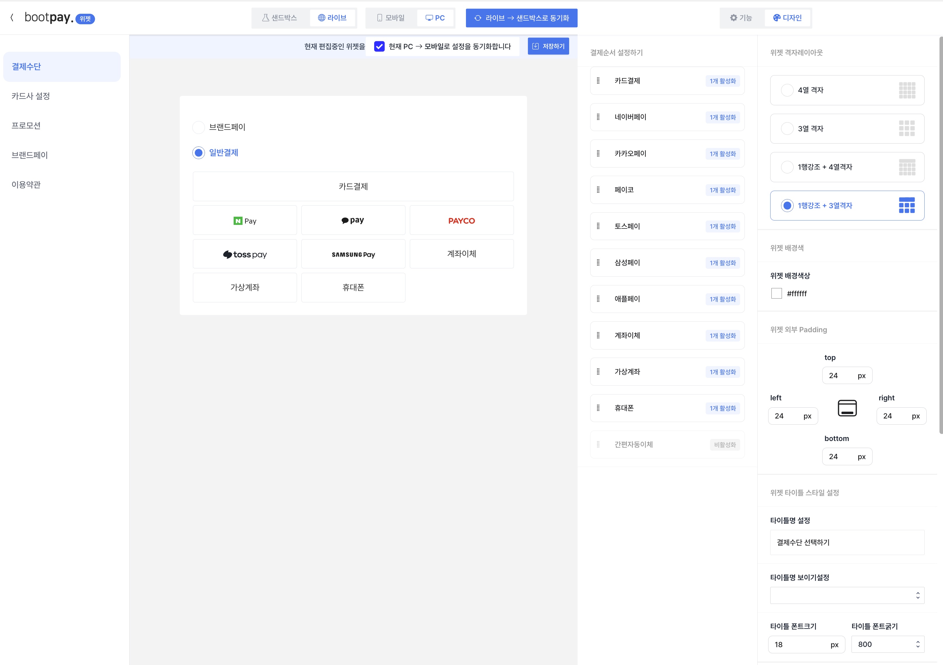 최초 1회 개발 연동 후에는 노코드로 결제수단을 추가하거나 디자인을 변경할 수 있어요. 브랜드페이, 간편결제, 카드 등 다양한 결제수단을 빠르게 도입하세요.