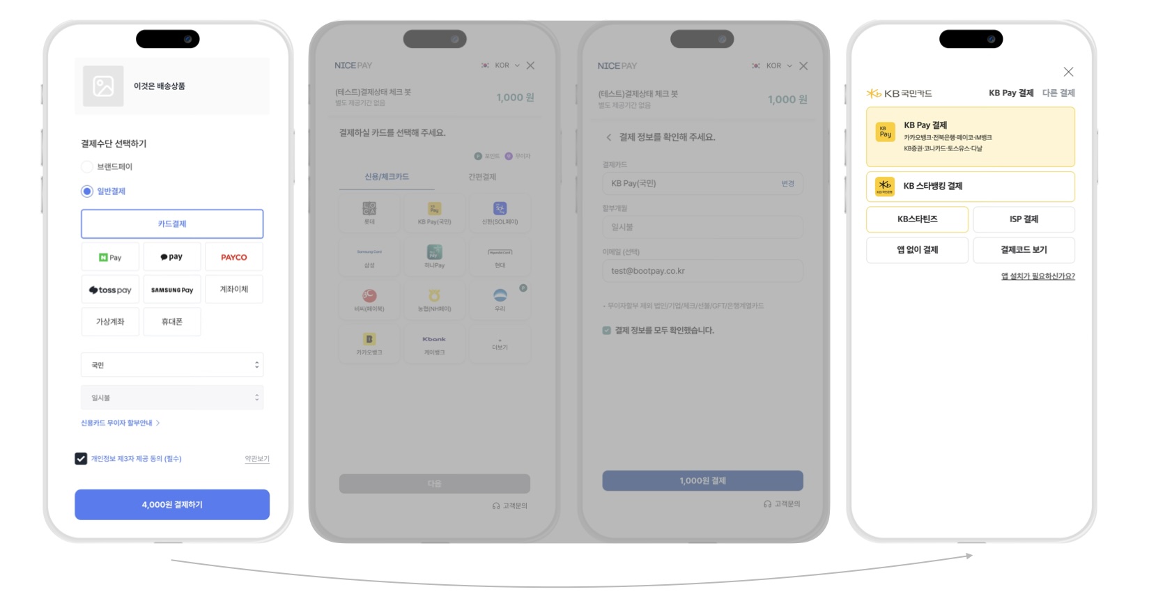 다양한 결제수단을 하나의 UI에 반영할 수 있어요.현재 위젯을 공식적으로 지원하지 않는 PG사도 부트페이를 통해 위젯을 사용할 수 있어요.KCP, 나이스페이, 라이트페이를 지원하며, 앞으로 더 많은 PG사를 추가할 예정입니다.또한 스마트 라우팅 기능으로 트래픽을 분산하여 안정적인 결제 환경을 제공합니다.